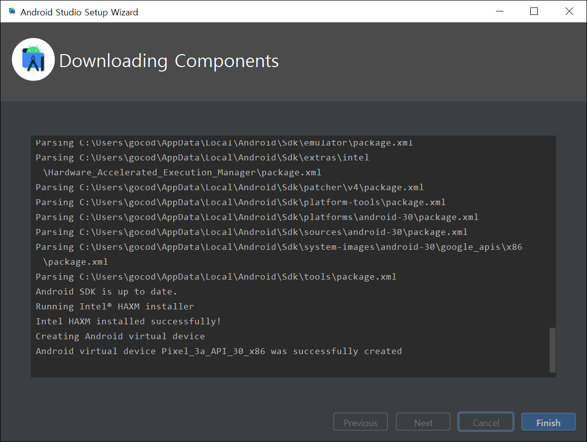 ● 17. 이제는 기타 설치들이 실행됩니다. 각종 SDK와 필요한 파일을 안드로이드 스튜디오가 자동으로 설치합니다. finish를 클릭합니다.