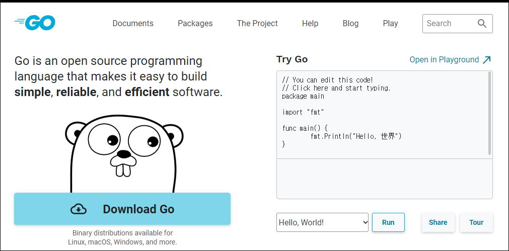 ● 1. Go의 공식 웹사이트는 https://golang.org/ 이라는 주소를 가진 사이트입니다. 사실 사이트 분위기나 이미지가 유아 코딩처럼 느껴질 정도로 애니 틱 하지만 최고의 개발자가 만든 언어 Go의 공식 홈페이지입니다. 홈페이지를 자주 방문해야 하는 이유가 하나 있습니다. 바로 Go를 실행할 수 있는 온라인 IDE 환경을 제공해주기 때문입니다. 홈페이지를 접속하자 보이는 화면도 바로 Go의 헬로우 코드를 실행해 볼 수 있는 화면이 나타납니다.