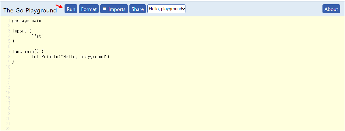 ● 2. 그리고 해당 주소로 접속하면 본격적으로 GO를 테스트할 수 있는 온라인 환경이 나타납니다. Run을 클릭하면 바로 실행이 가능합니다.