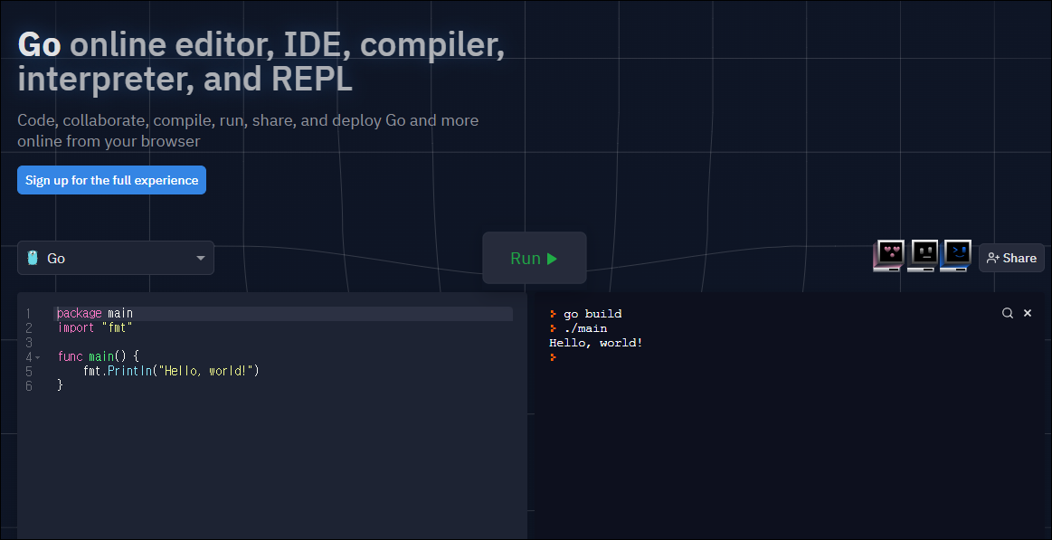 ● 2. 해당 주소를 접속하면 Go를 실행할 수 있는 온라인 IDE가 나타납니다. 가독성도 뛰어나고 로그인 없이 사용이 가능합니다. 정말 편리합니다.