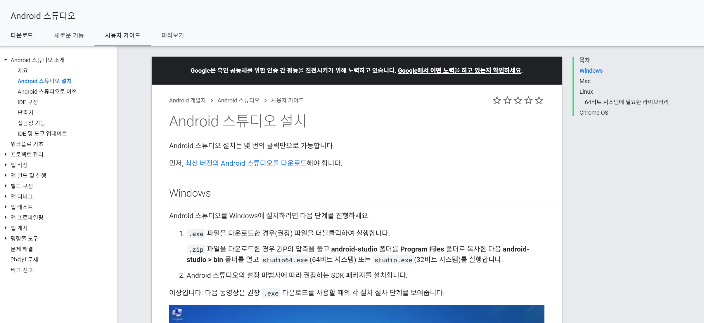 ● 1. 이번 시간에는 안드로이드 스튜디오에서 제공하는 공식 가이드북을 확인하는 방법을 알아보겠습니다. 많은 블로거들이 안드로이드 스튜디오를 친절하게 설명하고 있지만 그래도 구글이 제공하는 공식 가이드를 확인하고 다른 자료를 검토하는 것이 더 좋다고 생각합니다. 보통 이런 공식 가이드는 이해를 돕기 위한 게 아닌 사실을 전하기 위해서 작성된 것이므로 이해되지 않더라도 한번 정도 정독해보시길 바랍니다.