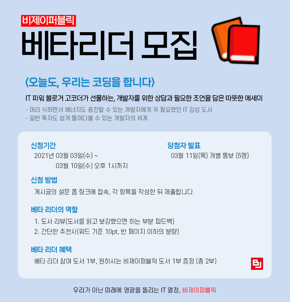 ■ 비제이퍼블릭 <오늘도, 우리는 코딩을 합니다> 책의 베타 리더를 모집합니다!