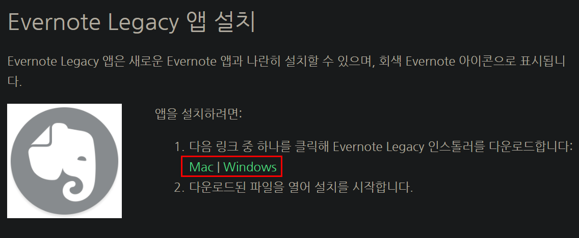 2 1. 그래도 다행힌건 에버너트는 구버전 즉 이전처럼 데이터를 하드디스크에 동기화 하고 사용가능한 버전을 공식 홈페이지에서 제공합니다. 해당 링크를 따라가면 구버전 에버노트를 제공하고 있습니다. 맥, 윈도우 버전을 선택하세요.