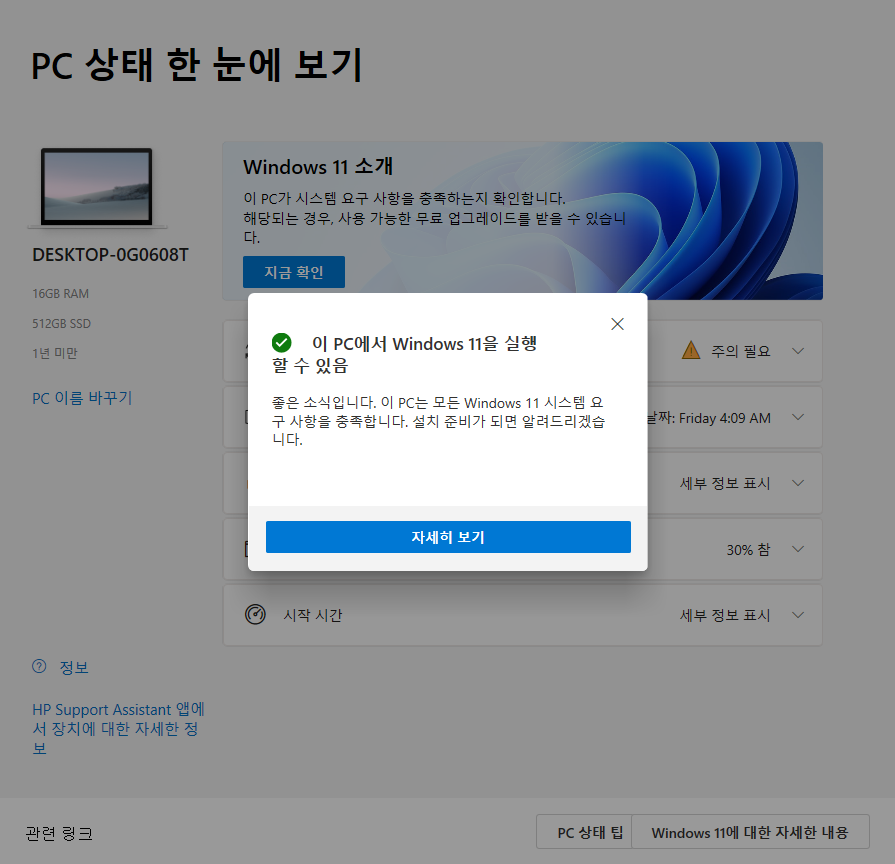 ● 5. 팝업 창으로 해당 PC가 업그레이드가 가능한지 확인할 수 있습니다.