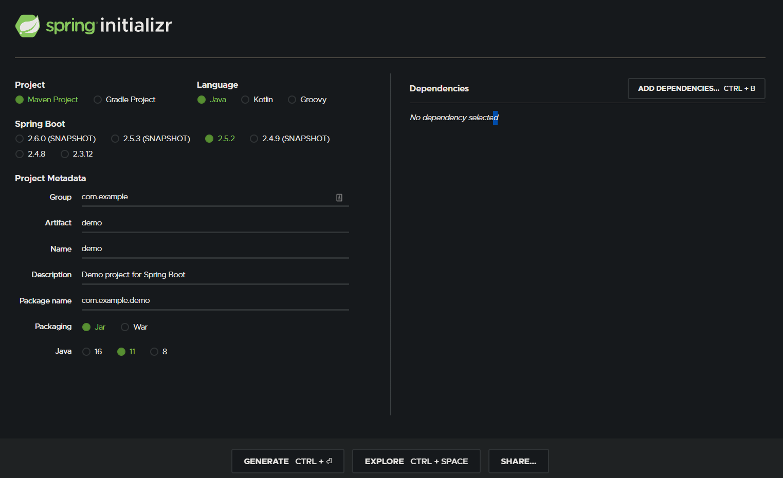 ● 1. 스프링부트를 학습하거나 이제 개발을 시작하는 분들에게는 참 멋지고 유용한 사이트를 하나 소개해드릴려고 합니다. 이 홈페이지는 클릭 몇번만으로 스프링부트를 실행할 수 있는 훌륭한 사이트입니다. 해당 페이지로 접속해보겠습니다. 외울 수 있다면 도메인을 기억해놓는 것도 좋아 보입니다.