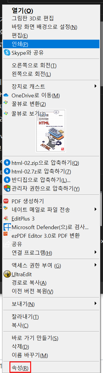 ● 1. 원하는 이미지에서 마우스 우클릭을 클릭합니다. 그리고 속성을 클릭합니다.