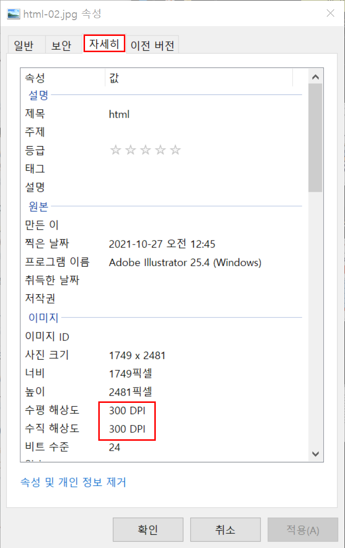 ● 2.그다음 상단 탭에 "자세히"를 클릭합니다. 그러면 이미지 정보가 표시된 아래에 DPI를 확인할 수 있습니다.