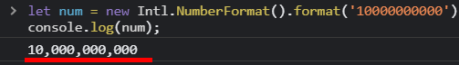 let num_jp = new Intl.NumberFormat('ja-JP', { style: 'currency', currency: 'JPY' }).format('1000000000');