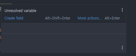 인텔리제이는 오류에 대한 다양한 메세지를 전달합니다. 중요한 문제점도 있지만 사소로운 거까지 보고하는 일 잘하는 친구입니다. 그래서 가끔은 알 수 없는 오류들이 나타나기도 합니다. 그중에서도 "unresolved variable"는 자주 보이는 메시지입니다.