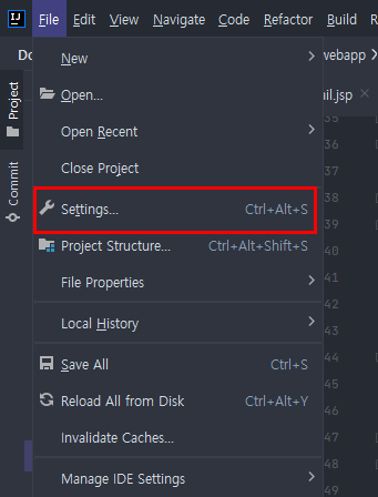 ● 1. 인텔리제이에서 File -> Settings로 이동합니다.