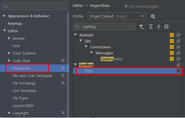 ● 2. 다음은 Inspections -> "Spelling"을 검색합니다. 그리고 해당 Typo 옵션을 체크 해제 합니다.