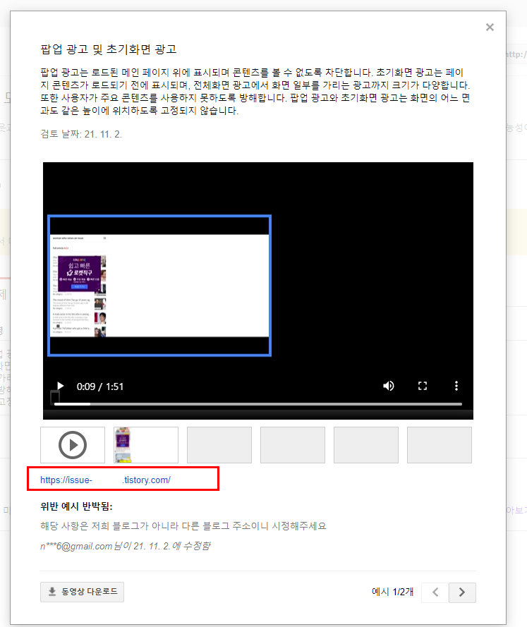 문제가 되는 블로그입니다. issue로 시작되는 한 블로거의 주소인데 여기서 강제 팝업 광고가 발생하여서 tistory.com을 쓰는 모든 티스토리에게 경고가 가고 있는 것입니다. 애드센스는 하위 도메인을 하나의 사이트로 보기 때문입니다.