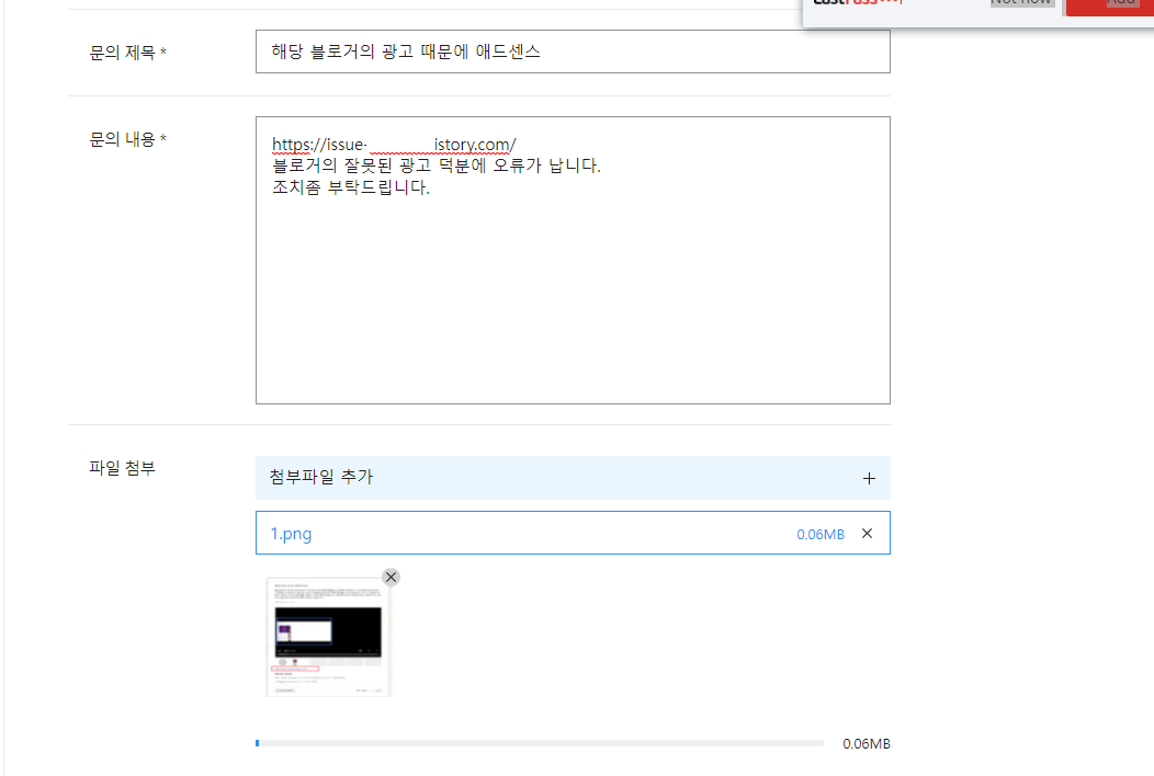 처리방법은 우선 해당 블로그를 고객센터에 문의드렸습니다. 잘못된 광고를 바로 잡아달라고 접수를 하였습니다. 앞서 말했다. 시피 애드센스가 하나의 사이트로 바라보고 경고를 띄우는 거라 해당 블로그의 불법적인 광고를 처리하는 게 중요한 거 같습니다.