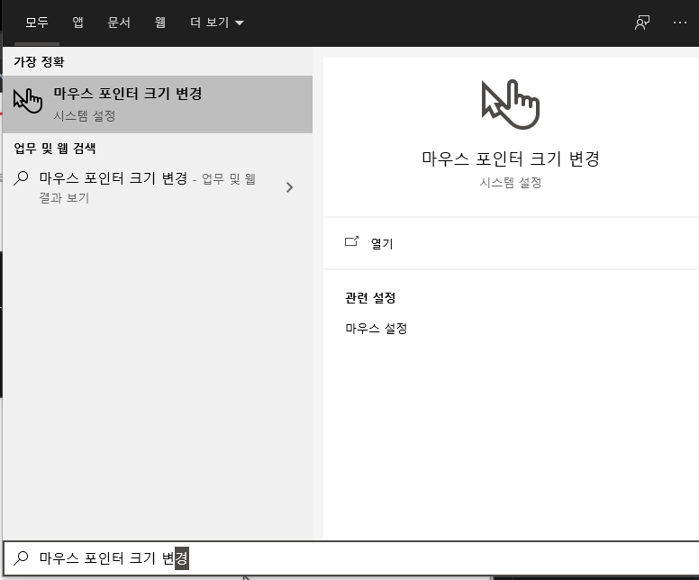 ● 1. 윈도에서 시작 버튼을 눌러 "마우스 포인터 크기 변경"이라고 검색어를 입력합니다. 그럼 직관적인 모양의 아이콘이 나타납니다.