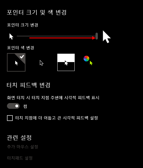 ● 2. 포인터 크기 변경에서 오른쪽으로 크기를 큰 반향으로 막대기를 옮기면 시원한 마우스 커서로 윈도를 즐기실 수 있습니다.