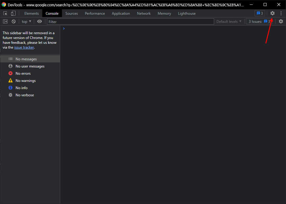 ● 1. 우선 크롬에서 개발자 도구를 실행합니다. 아디시다시피 F12입니다. 그리고 오른쪽 위에 있는 톱니바퀴 모양에 설정 버튼을 클릭합니다.