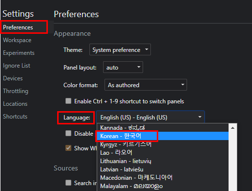 ● 2. settings에서 Preferences를 클릭하고 Language에서 언어를 한국어로 선택합니다.