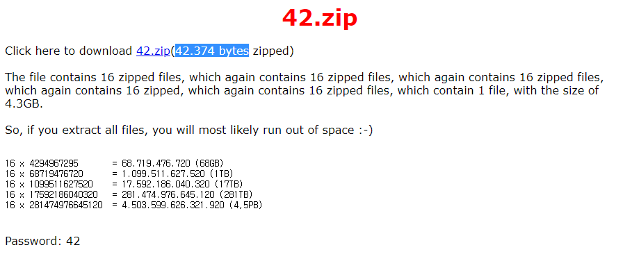 ● 222. 내용은 43.374 바이트 짜리 zip 파일을 풀다 보면 4.5PB가 된다고 합니다. 참고로 1PB는 1000TB이고 1TB는 1,000기가입니다.