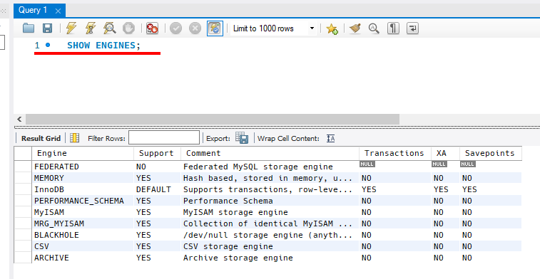| FEDERATED | NO | Federated MySQL storage engine | |||