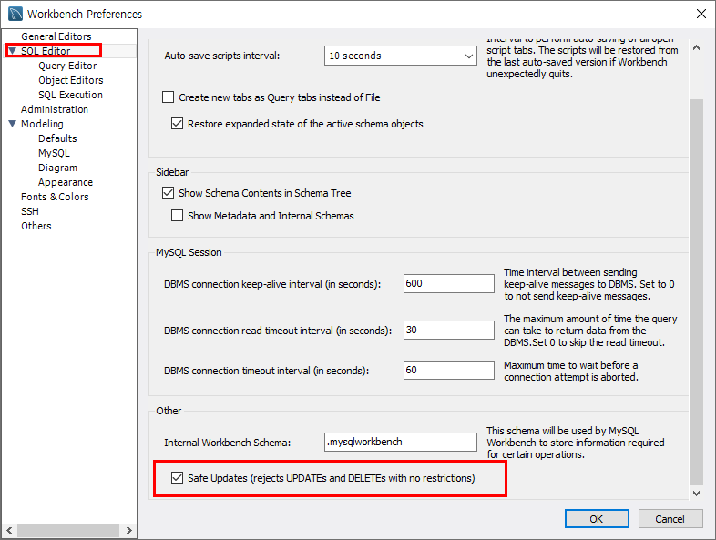 ●4. 그리고 Sql Editor에서 Safe Updates를 체크하고 OK를 클릭합니다.
