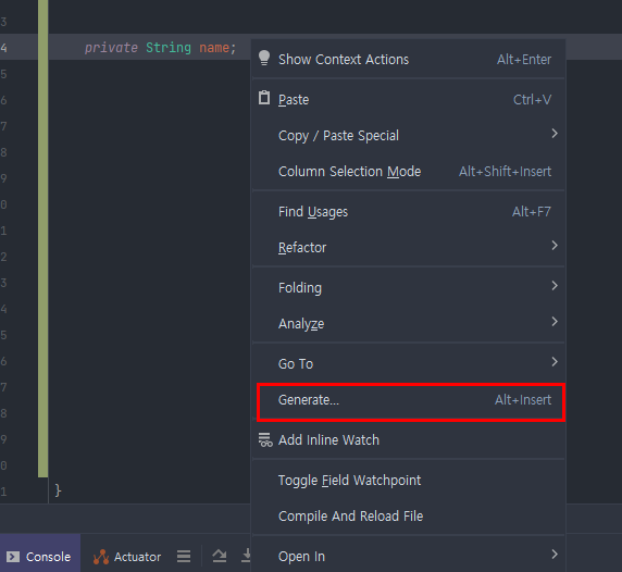 인텔리제이에서도 이클립스처럼 당연히 자동으로 겟터, 셋터를 만들 수 있는 기능이 있습니다. 그 방법을 한번 알아보겠습니다.
