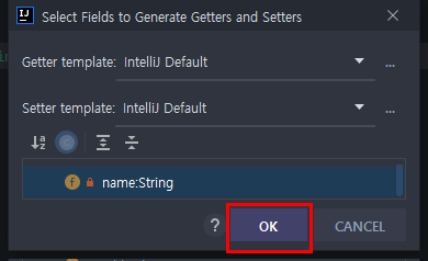 ● 2. 그리고 나타나는 메뉴에서 겟터, 셋터 생성이 필요한 변수를 클릭하고 OK를 선택합니다.