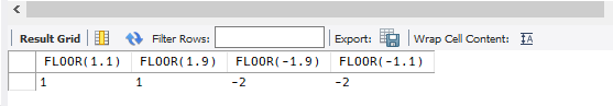 select FLOOR(1.1), FLOOR(1.9), FLOOR(-1.9), FLOOR(-1.1);