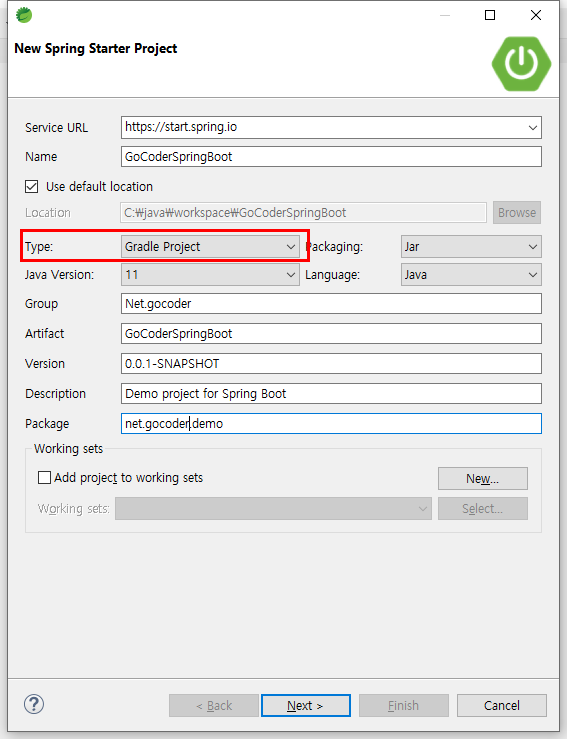 ● 2. 프로젝트를 생성합니다. 각 항목별로 필요에 맞는 항목을 기입합니다. 보통 이 기본 정보는 프로젝트와 관련된 정보들로 채우게 됩니다. 자신이 운영하는 도메인이 있다면 그 정보를 기준으로 입력해보시길 바랍니다. 귀찮다 하는 분은 기초 설정 그대로 사용하셔도 좋습니다. 다만 스프링 부트의 관리 도구는 보통 "Gradle"을 사용하기 때문에 이 부분은 꼭 바꾸시기 바랍니다.