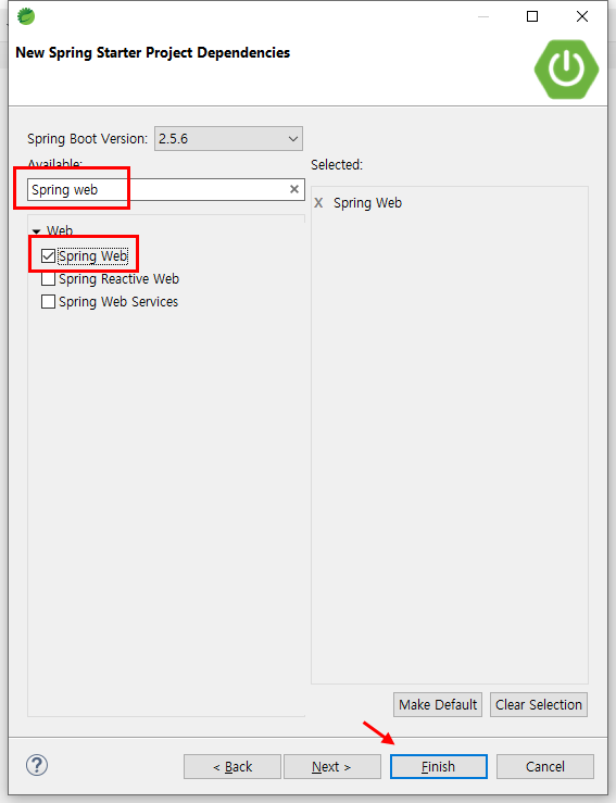 ● 4. 이제는 의존성을 주입합니다. Spring Boot Version은 기본으로 체크되어 있는 버전을 그대로 사용합니다. 화면보다 더 높거나 낮아도 크게 상관은 없습니다. 그리고 "Availlable"에서 "Spring web"을 검색합니다. 그리고 나타나는 Spring Web을 체크합니다. 왜냐하면 우리는 지금 스프링 웹 프로젝트를 시작하기 때문입니다.