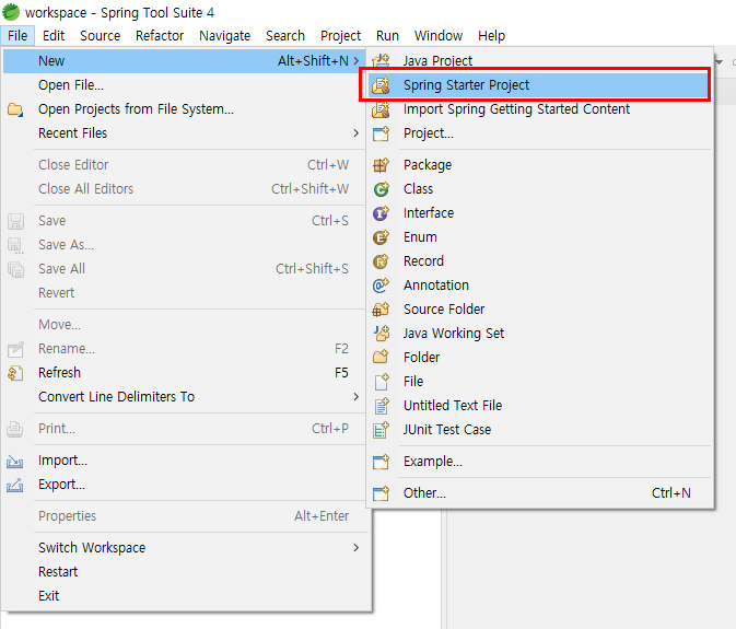 ● 1. STS4를 다운로드 받았다면, 이제는 스프링 부트 프로젝트를 실행해보겠습니다. 이클립스를 실행하고 File -> New -> Spring Starter Project를 실행합니다.