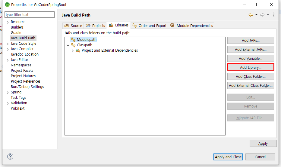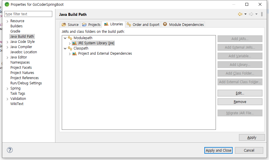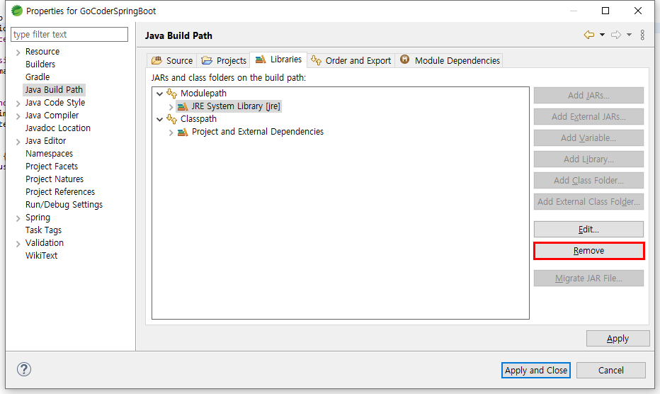 ●1."Java Build Path" -> "Libraries" 탭으로 이동 후 "JRE System Library"를 "Remove"를 통해 삭제합니다.