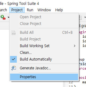 ●1. 상단 "project" -> "properties"로 이동합니다.