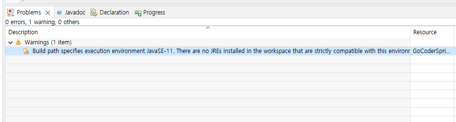 Description Resource Path Location Type Build path specifies execution environment JavaSE-11. There are no JREs installed in the workspace that are strictly compatible with this environment.