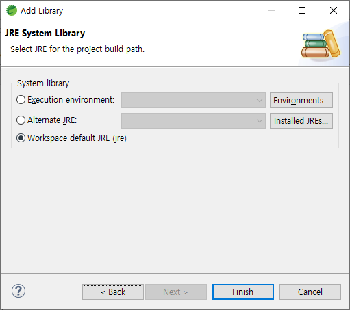 ●4. 다음 Workspacee default JRE를 선택하고 finish를 하면 완료됩니다,