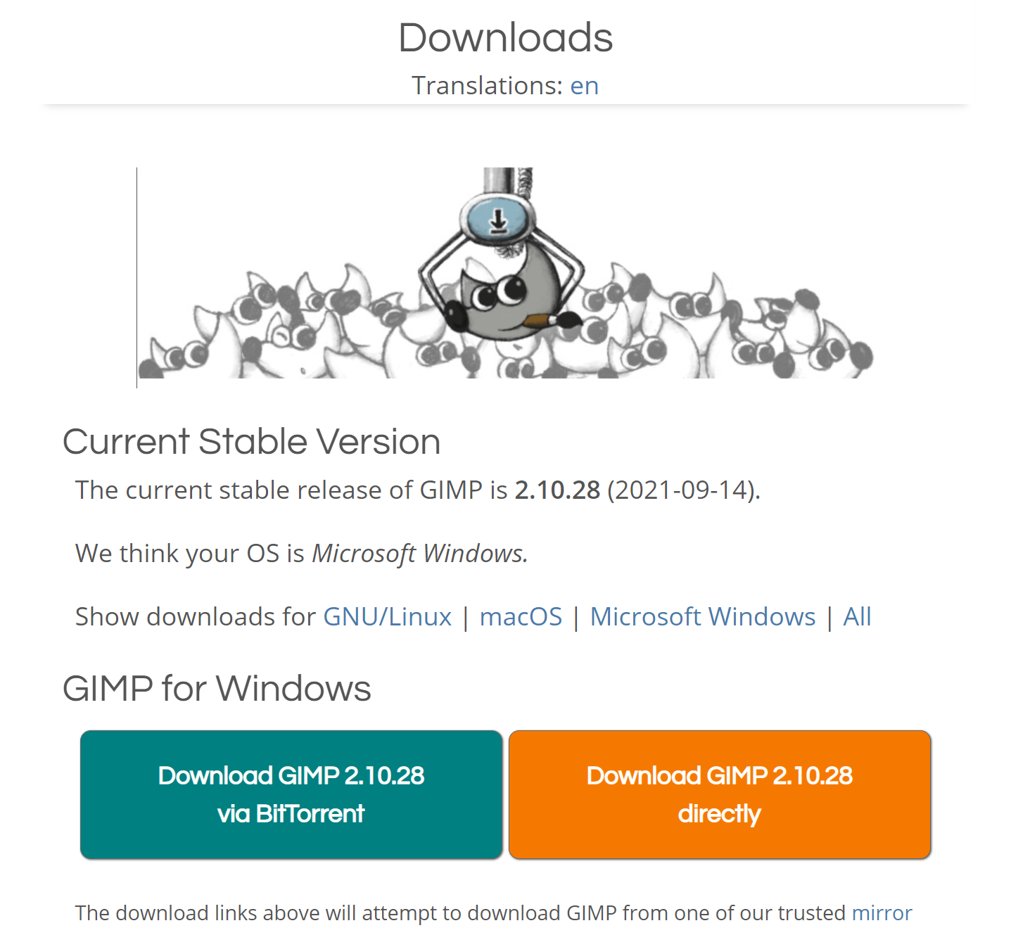The official download page for all things GIMP! Please only use the official binaries provided here unless you really, really know what you’re doing (it’s the only way to be safe). We try to provide binaries in-time with regular releases, but may occa