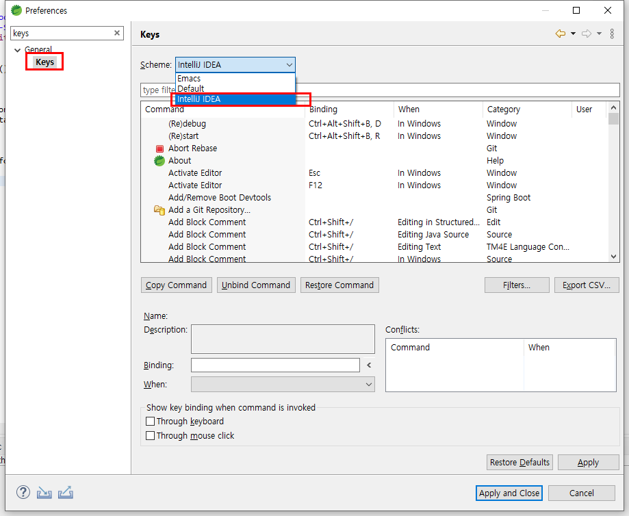 ● 5. 검색어 "keys"를 검색하고 해당 메뉴에서 Scheme를 "IntelliJ IDEA"를 선택하고 적용하면 인텔리제이 단축키로 이클립스를 사용이 가능합니다.