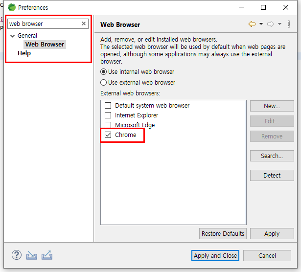 ● 2. 환경설정에서 "Web browser"를 클릭합니다. 그리고 해당 메뉴에서 Chrome을 선택하면 이클립스 기본 웹 브라우저를 크롬으로 사용이 가능합니다.