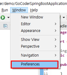 ● 1. 먼저 이클립스에서 메뉴 탭에서 "Window -> Preferences"를 클릭합니다.