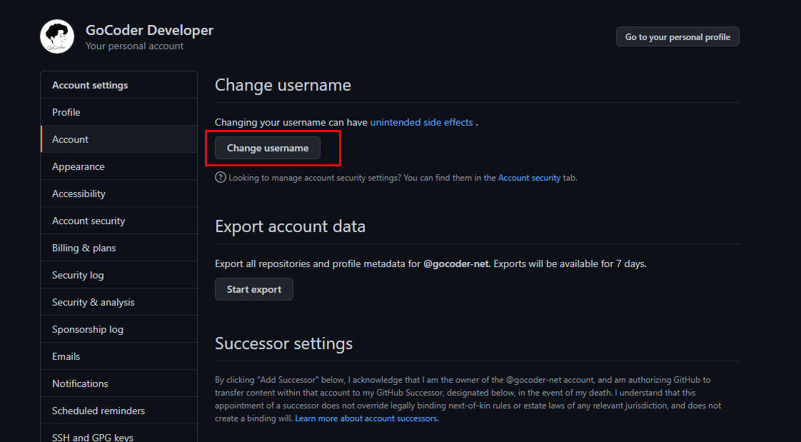 ● 2. 그다음 왼쪽 Account 메뉴를 클릭하면 오른쪽에 Change username 버튼이 눈에 들어옵니다.