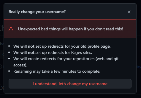 ● 3. 그리고 버튼을 클릭하면 아래와 같이 경고합니다. 인지 했다면 "I understand, let’s change my username" 클릭합니다.
