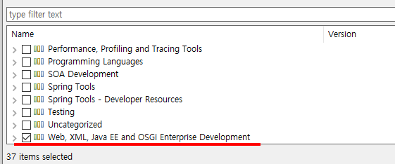 ● 4. 나타난 리스트에서 "Web, XML, Java EE and OSGi Enterprise Development"를 체크하고 next를 클릭합니다.