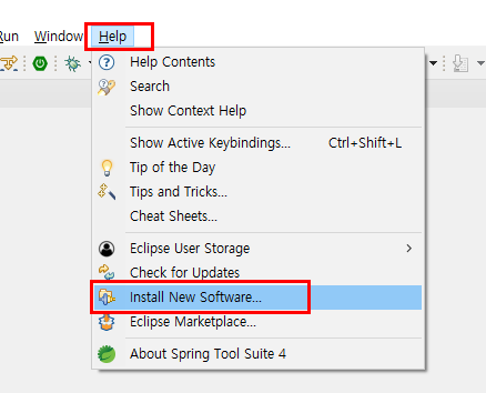 ● 2. 상단 탭 메뉴에서 HELP로 이동합니다. 그리고 Install New Software를 선택합니다.