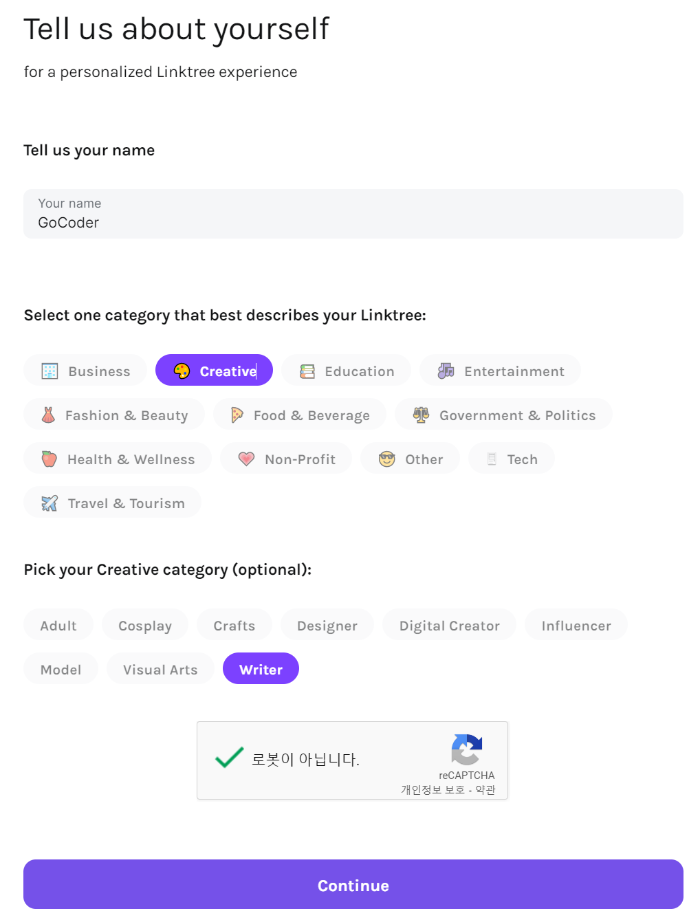 ● 2. 다음 자신의 이름과 카테고리를 선택합니다. 저는 작가로 분류 해보았습니다.