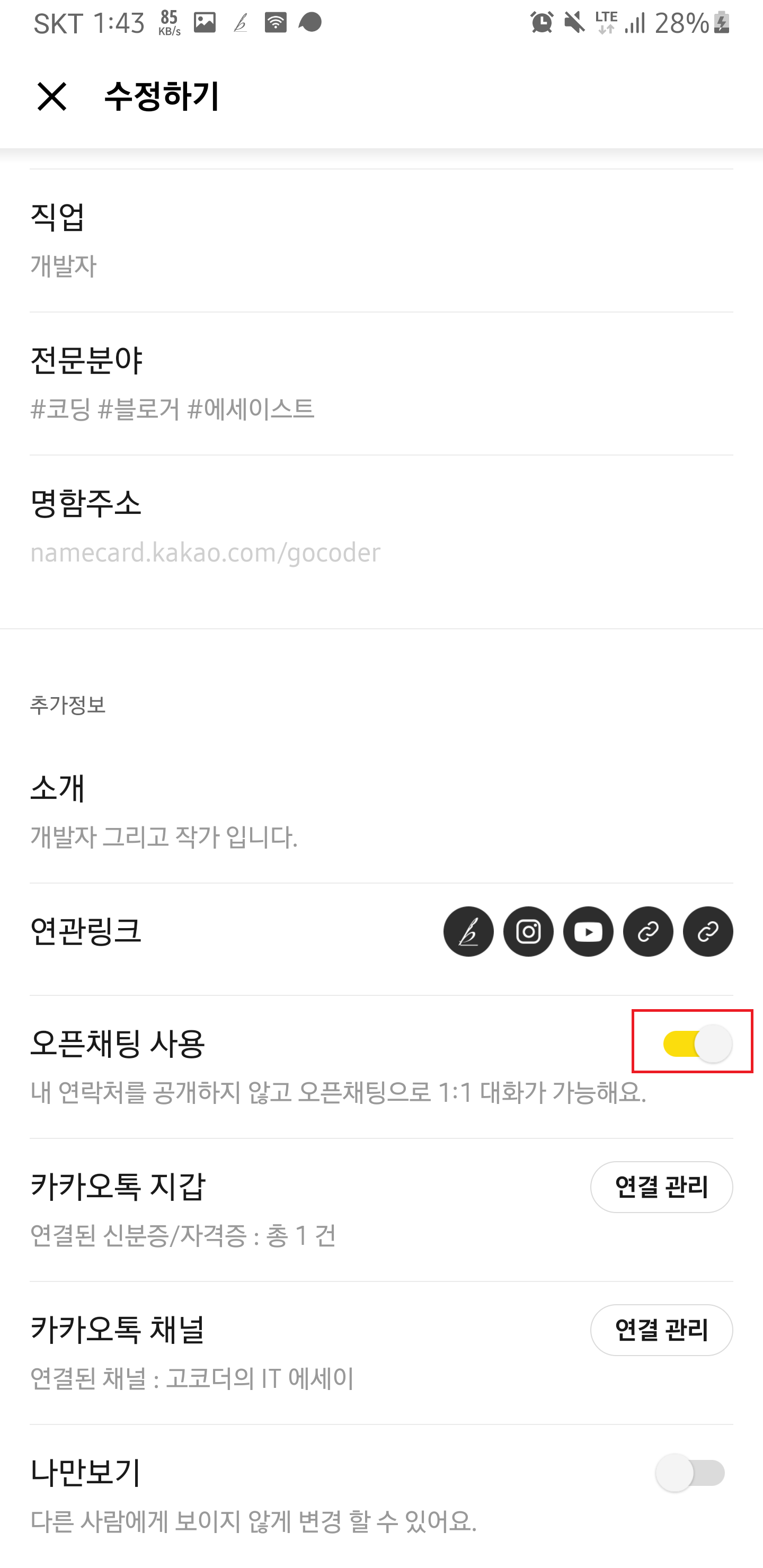 ● 3. 스크롤을 아래로 내리면 오픈 채팅 사용을 클릭하면 이제 톡 명함에서 오픈 채팅이 사용 가능합니다.