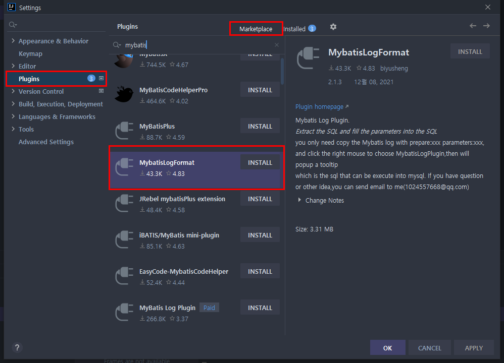 ● 2. 환경설정에서 플러그인으로 이동하고 마켓플레이스에서 "MybatislogFormat"를 검색하여 인스톨합니다.