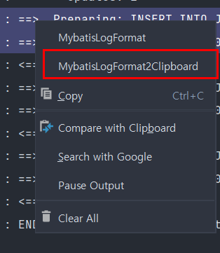 ● 1. mybatis를 쓰다 보면 SQL문과 파라미터가 분리되어 있어 불편할 때가 있습니다. 그럴 땐 이 플러그인을 사용하면 쉽게 SQL을 확인할 수 있습니다. "mybatislogformat"입니다.