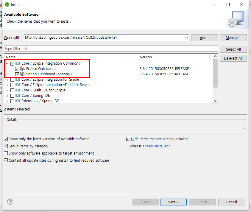 ● 2. 다음은 아래 Work with 안에 URL를 붙여 넣습니다. 그리고 나온 리스트 중에 아래처럼 퀵 서치가 있는 애드온을 추가합니다. 그리고 Next를 클릭합니다.