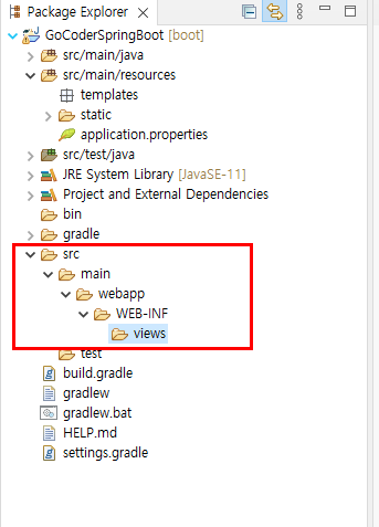 스프링 부트에서 그래들 환경에서는 JSP를 사용하기 위해 몇 가지 설정해야 합니다. 그리고 JSP 폴더 위치를 지정해줘야 합니다.