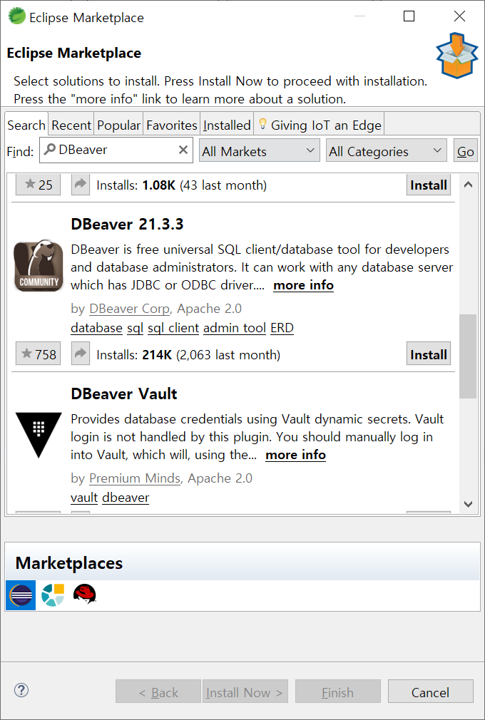 ● 1. 이클립스 마켓플레이스에서 'DBeaver'를 검색합니다.