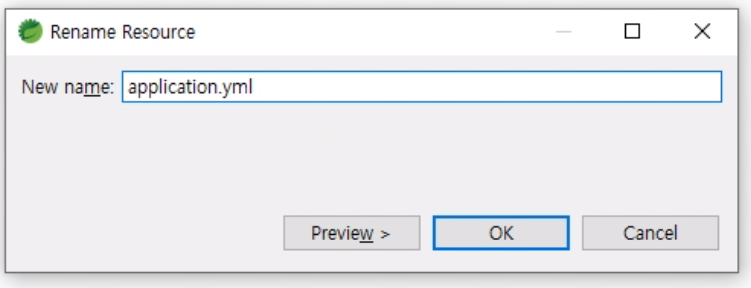 ●2.첫 번째 방법은 기존 프로퍼티 파일 확장자만 변경해주는 방식입니다. F2를 눌러서 아래처럼 확장자만 변경해주면 됩니다. 안에 내용은 yml 형식으로 변경해야 합니다.